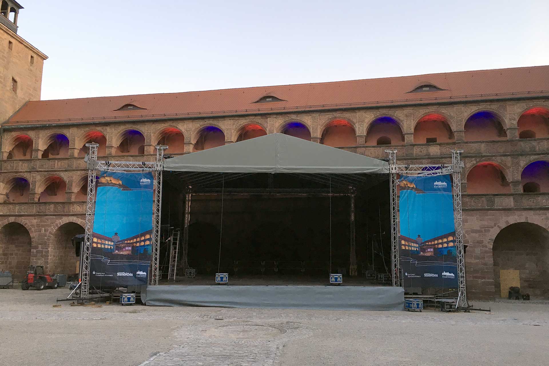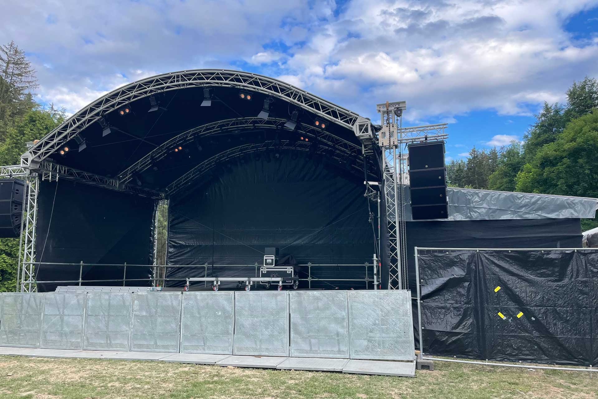 Um Lautsprecherkomponenten für die Beschallungsanlage ordentlich anschlagen zu können, ist im Baubuch des Bühnendach die Möglichkeit zum Anbringen von Auslegern vorgesehen. Diese Sidewings können je nach Ausführung sehr große Lasten aufnehmen. Außerdem eignen sie sich hervorragend zum Befestigen von Werbebannern und tragen somit zur besseren Optik der Bühne bei.