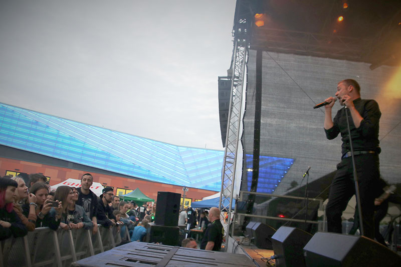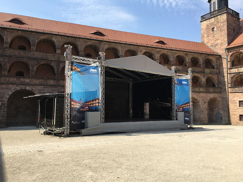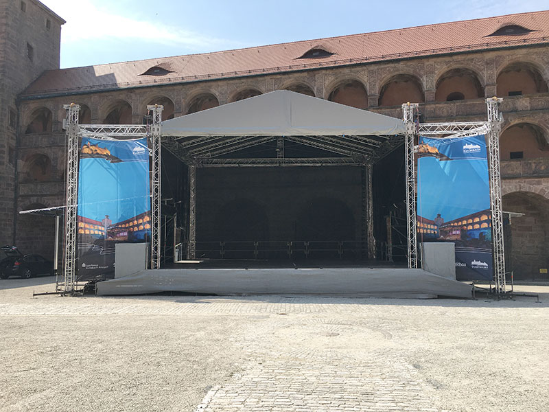 13m x 11m Bühnenfläche mit Sidewings und 4m x 4m Monitoranbauten