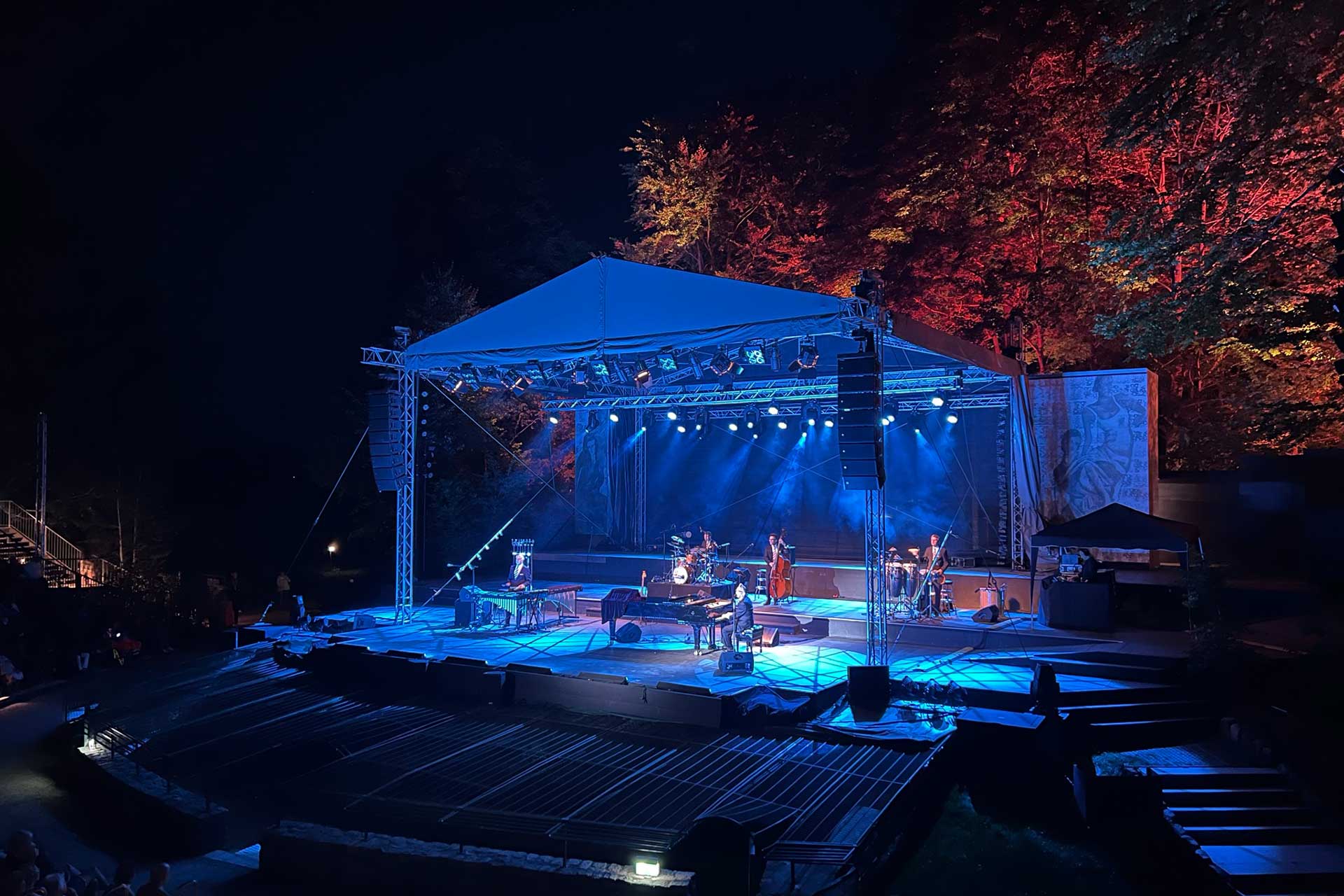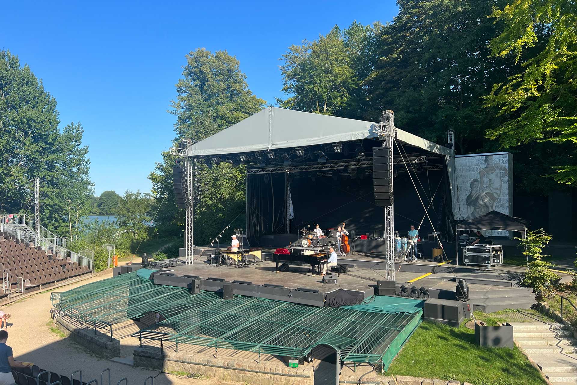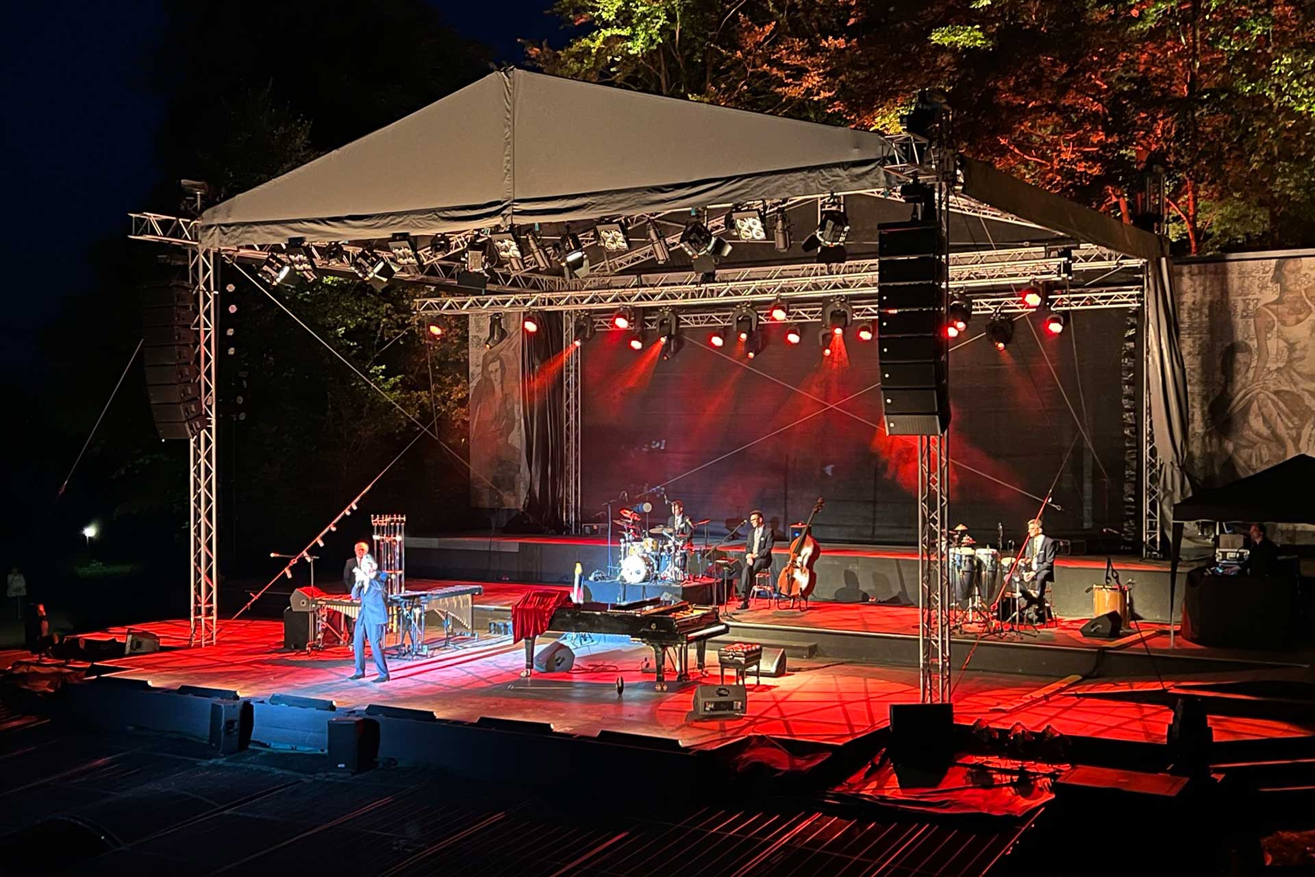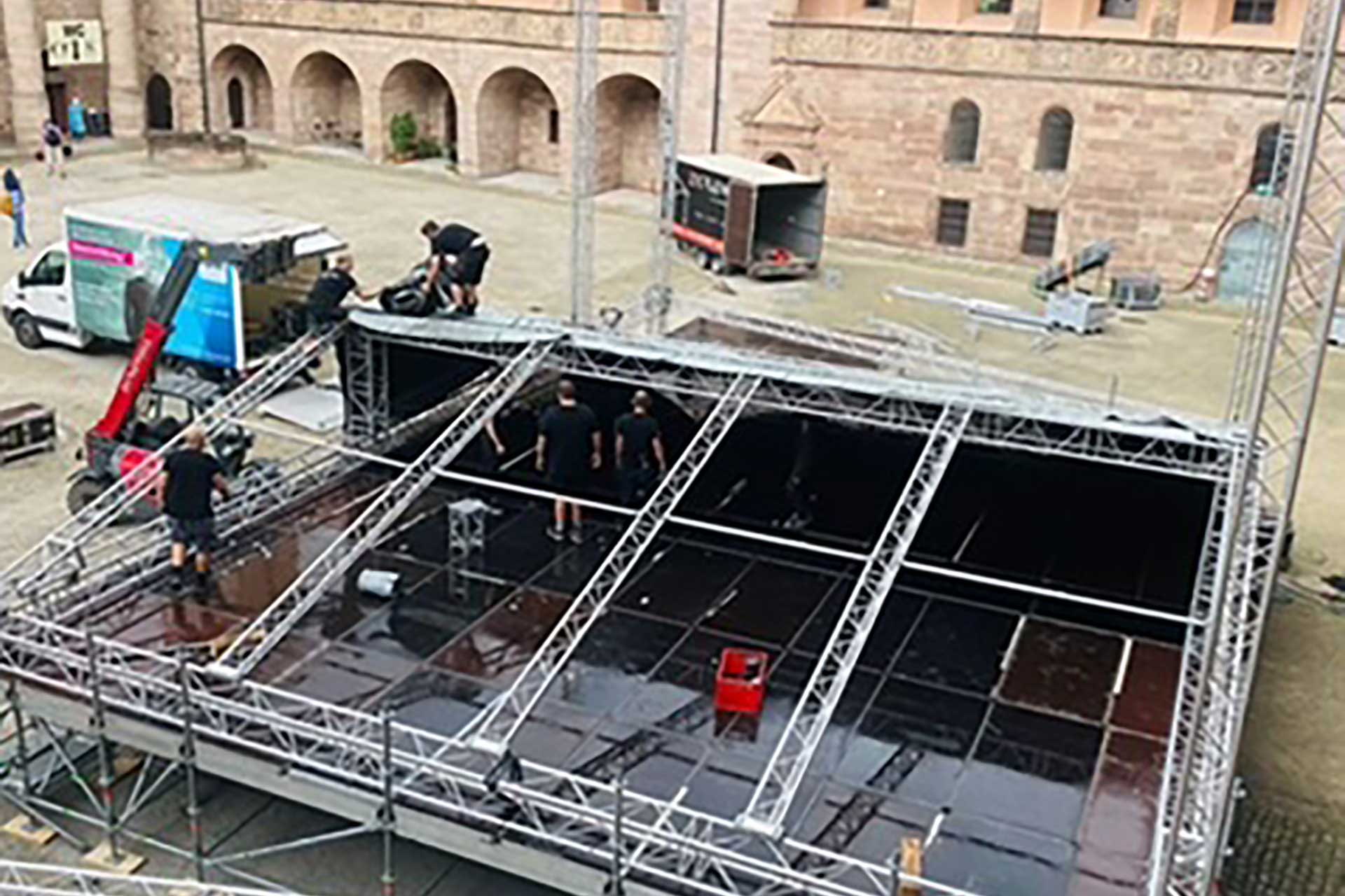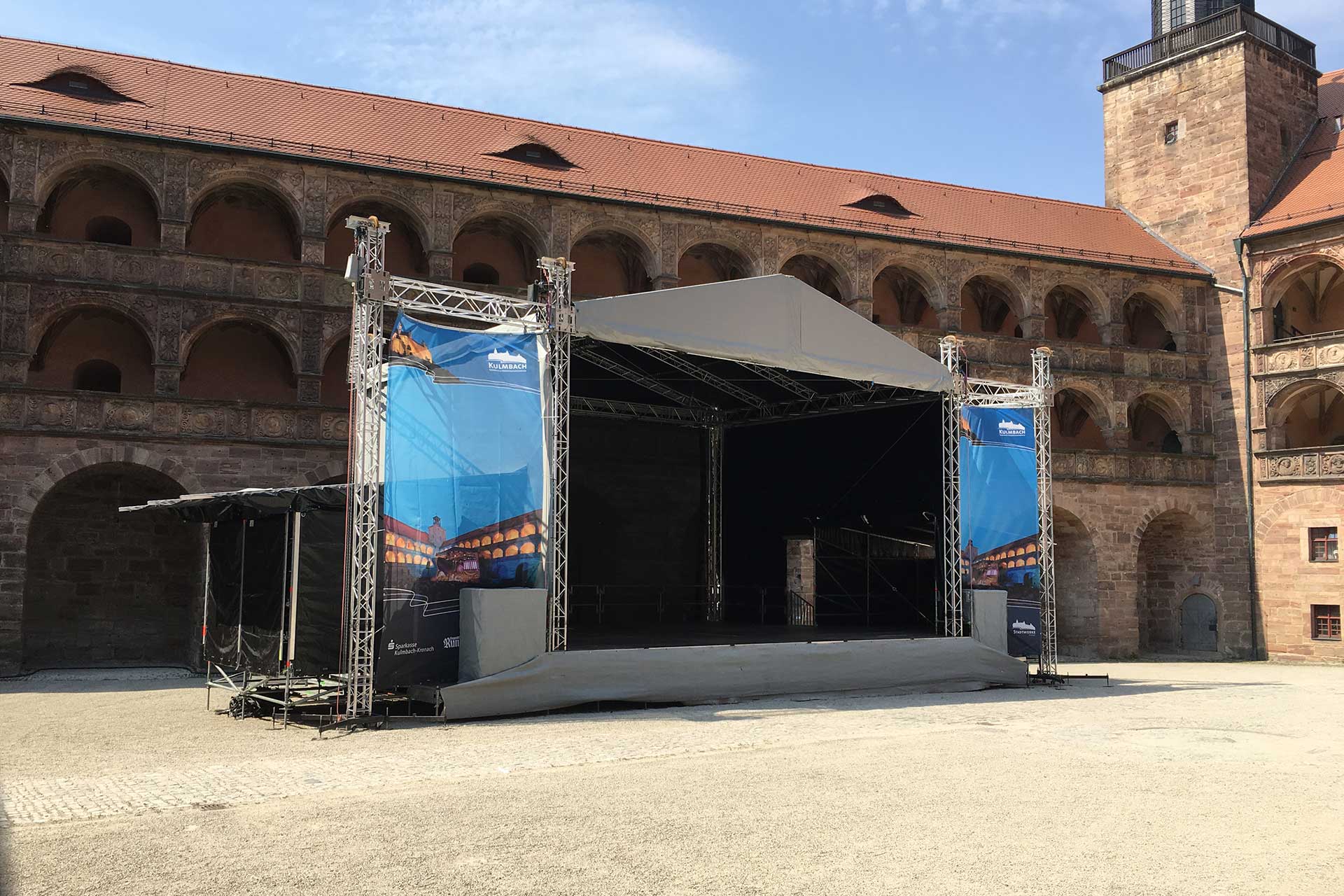 Dieses Giebeldach wird mit einer Podiumfläche von 13m x 11m aufgebaut. Inklusive der beiden Sidewings erreicht es eine Gesamtbreite von ca. 20m. Die lichte Höhe ab Podium beträgt ca. 6m bis Dachunterkante. Durch das direkte Aufsetzen auf das Podium erreicht die Dachkonstruktion eine maximale Stabilität gegen Windlasten, wodurch die zusätzlich nötige Ballastierung auf ein Minimum reduziert werden kann.