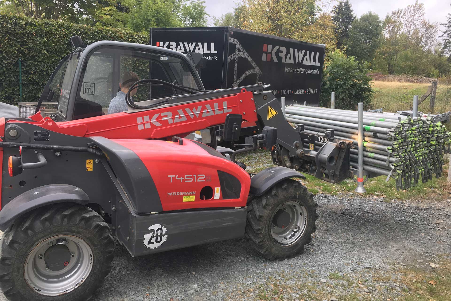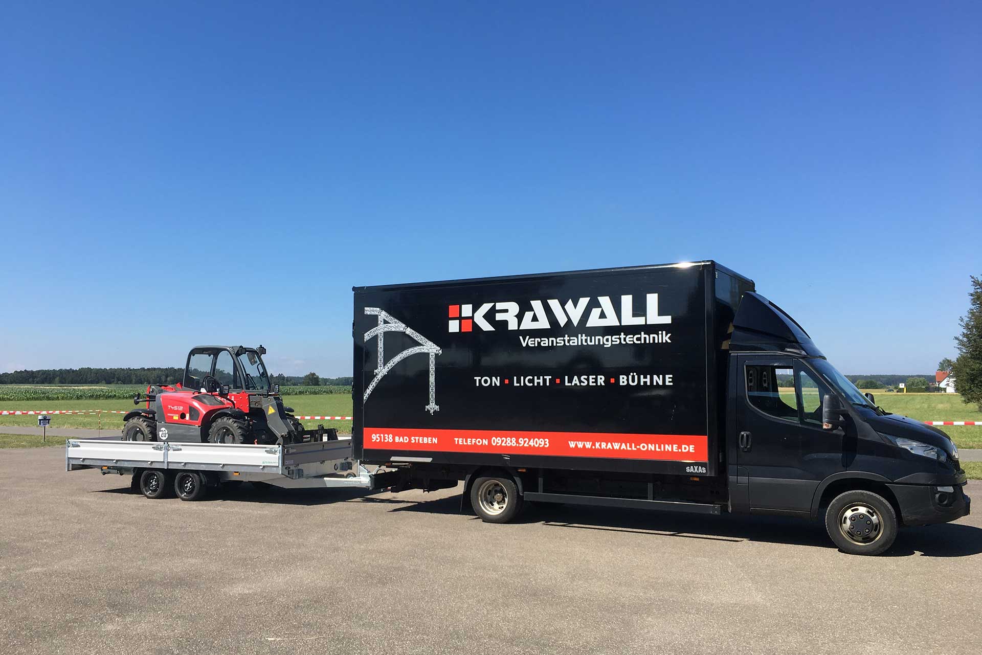 Mit Kofferanhänger oder 15 tonner! Wir haben die Möglichkeit, das Veranstaltungsequipment an jeden beliebigen Ort zu liefern. Unser Teleskoplader kann schweres Bühnenmaterial in den kleinsten Winkel schaffen.
